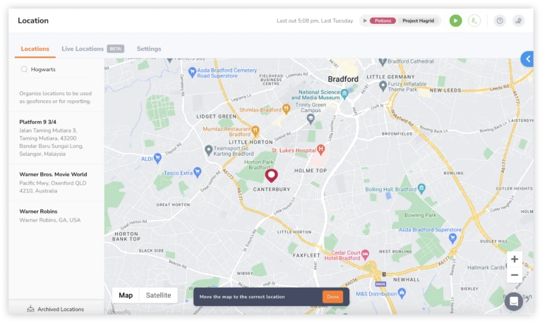 - قم بسحب وإفلات الدبوس على الخريطة لزيادة الدقة في تحديد الموقع الذي ترغب في تسجيله. بعد التأكد من الموقع المحدد، انقر على تم “Done“.