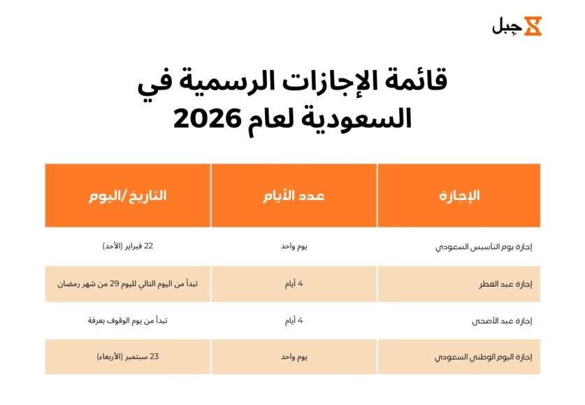 قائمة الإجازات الرسمية في السعودية لعام 2026 مجانية من جِبل