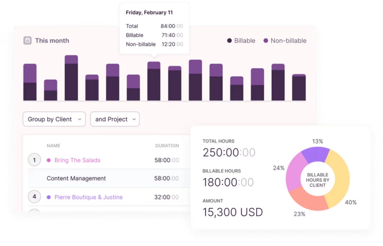 For teams, Toggl Track keeps everything organized with project and client-based tracking, so you can see where time goes and how it ties back to budgets or billable hours.