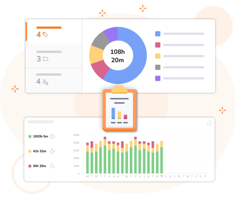 Mit angepassten Zeit- und Anwesenheitsberichten und visuellen Diagrammen erhältst du einen tieferen Einblick in die Arbeitszeiten deiner Mitarbeiter. Filtere, sortiere und exportiere die Daten nach Benutzer, Tätigkeit oder Projekt, um Produktivitätstrends und die allgemeine Zeitnutzung zu erkennen. Exportiere die Berichte als CSV, XLS oder direkt in deine Lohnsoftware. Du kannst auch wöchentliche oder tägliche Teamberichte planen, die automatisch direkt in deinen Posteingang geschickt werden!