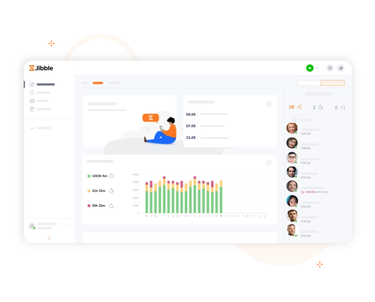 ProjektzeiterfassungJibble macht das Ein- und Ausstempeln für dein Team echt einfach. Dank unserer benutzerfreundlichen Oberfläche können deine Mitarbeiter ganz einfach ein- und ausstempeln, ihre Arbeitsstunden Aktivitäten, Projekten und Kunden zuweisen und ihre Pausen verwalten – alles auf einer Plattform.