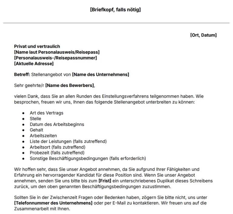 Lade diesen Musterbrief für ein Stellenangebot herunter: ein offizielles Dokument, das potenziellen Mitarbeitern und Bewerbern eine Anstellung anbietet.