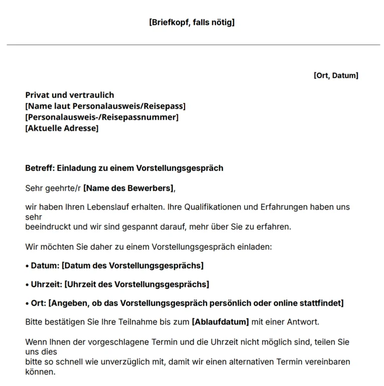Vorlage für eine Einladung zu einem Vorstellungs-gespräch