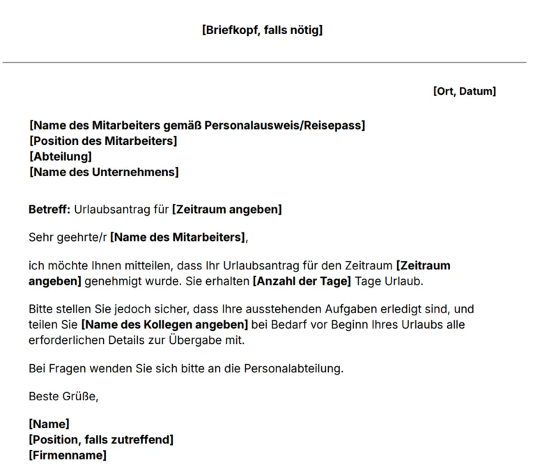 Vorlage für ein Schreiben zur Urlaubsgenehmigung für Mitarbeiter. Jetzt herunterladen.