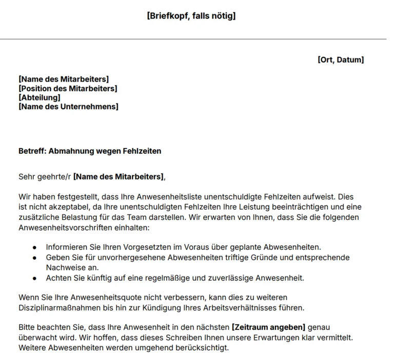 Kostenloser Musterbrief für eine Abmahnung bei Fehlzeiten eines Mitarbeiters. Jetzt herunterladen!