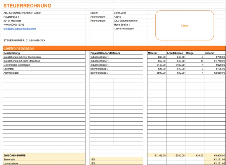 Rechnungsvorlage für Subunternehmer. Jetzt herunterladen.