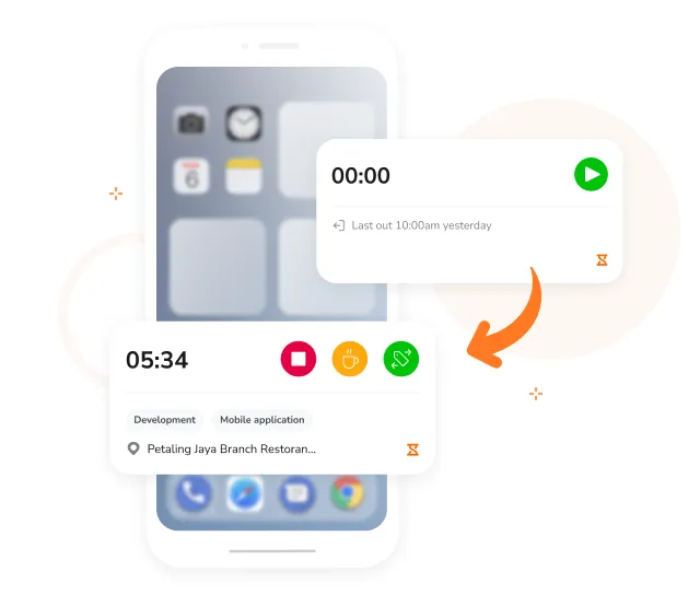 Nutze Jibbles Zeiterfassungs-App für iPhone und Zeiterfassungs-App für Android, um die Zeiterfassung auf deinen persönlichen Geräten mühelos zu gestalten. Erhöhe den Komfort mit dem Jibble-Widget für blitzschnelle Zeiterfassungen direkt vom Startbildschirm aus!