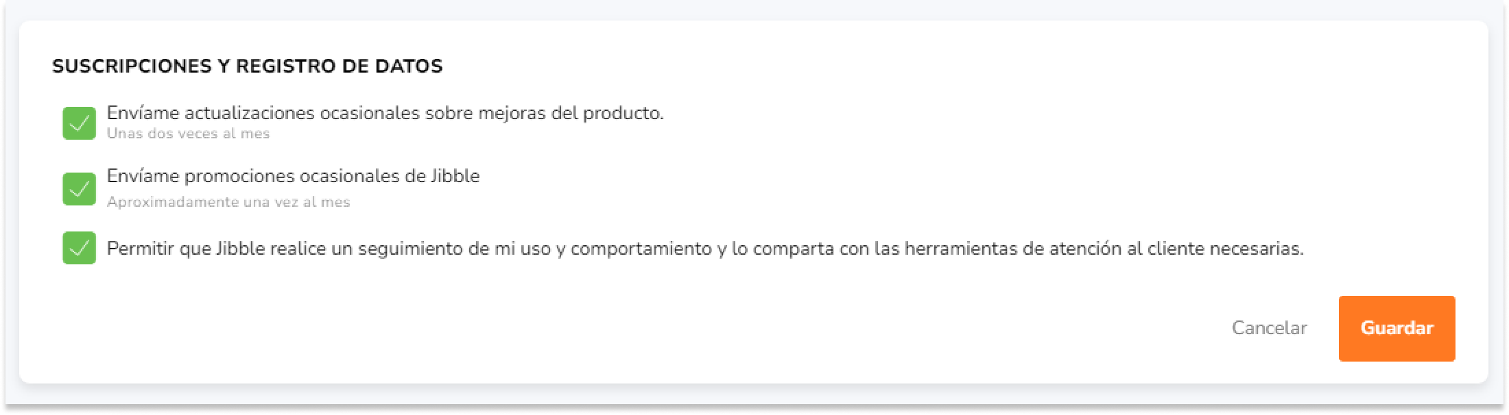 Por defecto, Jibble registra los datos del usuario cuando se registra por primera vez. Si desmarcas esta opción, dejaremos de registrar tu uso, comportamiento y otros datos.