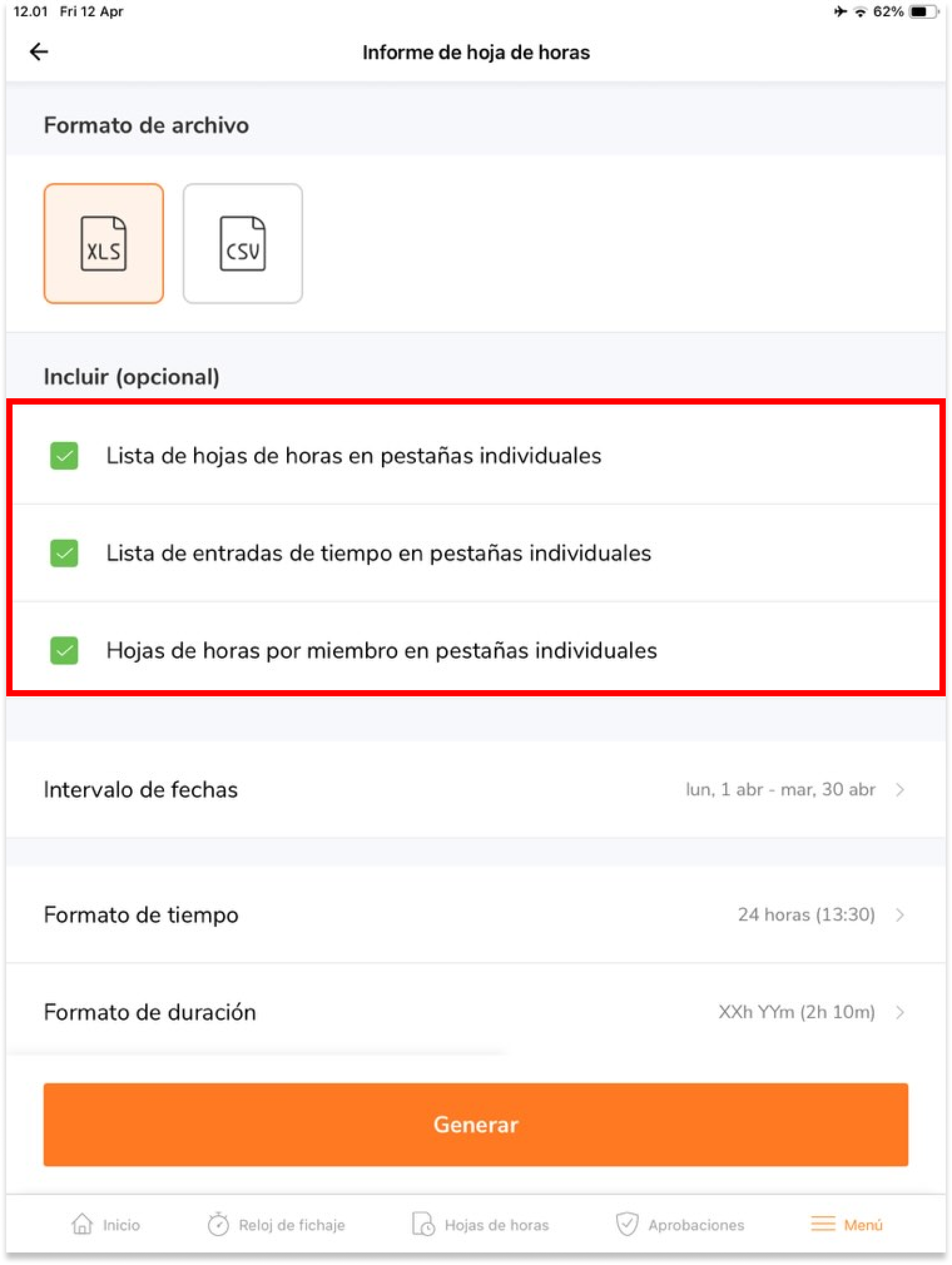 - Selecciona el rango de fechas del que quieres exportar los datos de tiempo.