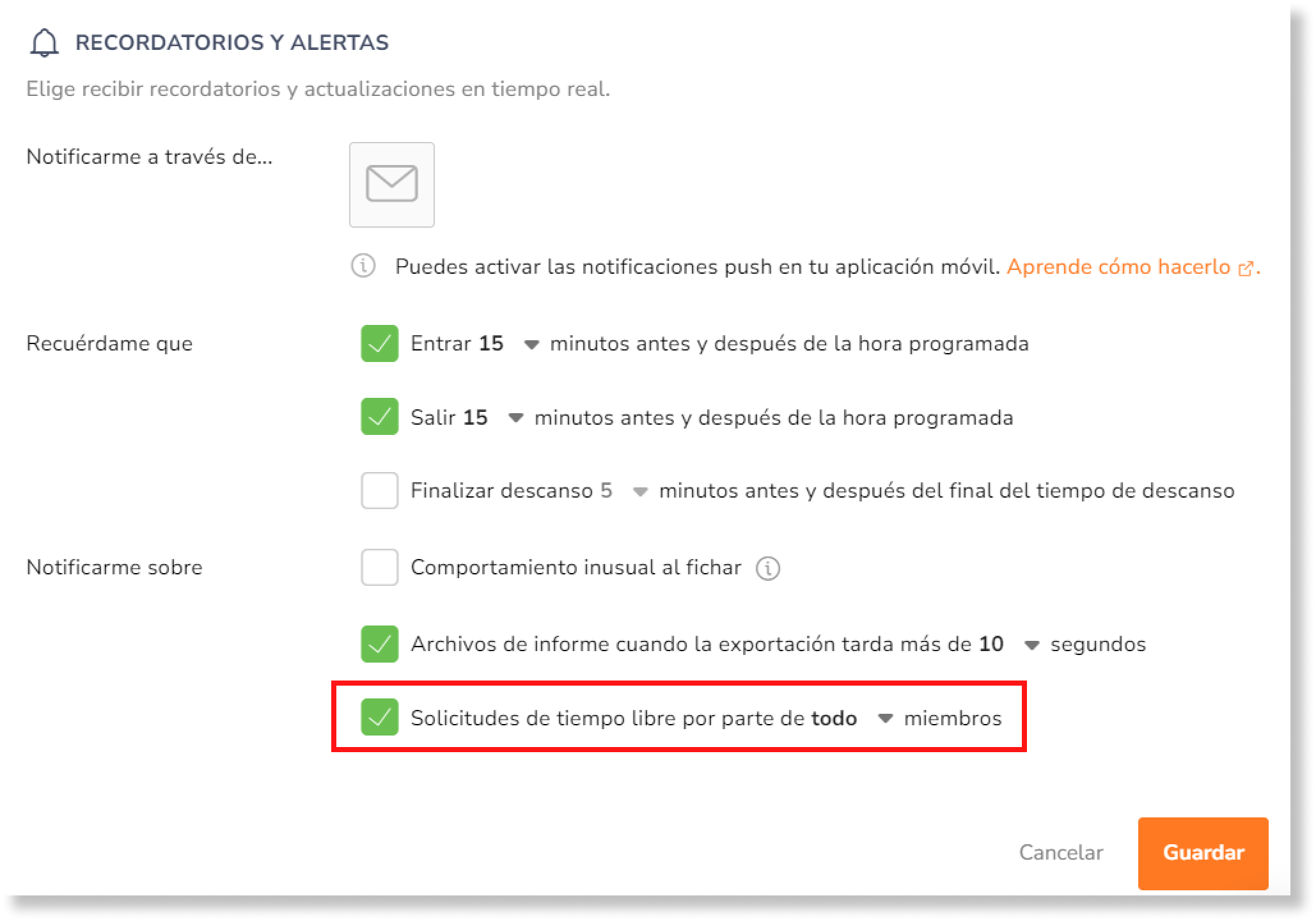 - En la sección Recordatorios y alertas, selecciona la casilla correspondiente a Solicitudes de tiempo libre.