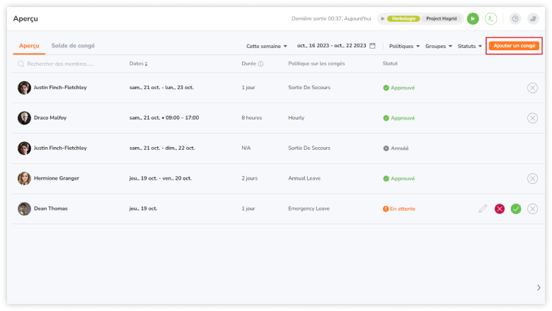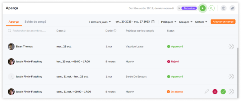- Utilisez le champ de recherche pour rechercher un membre de l’équipe ou filtrez les congés par date, politiques et statuts pour affiner vos résultats.
