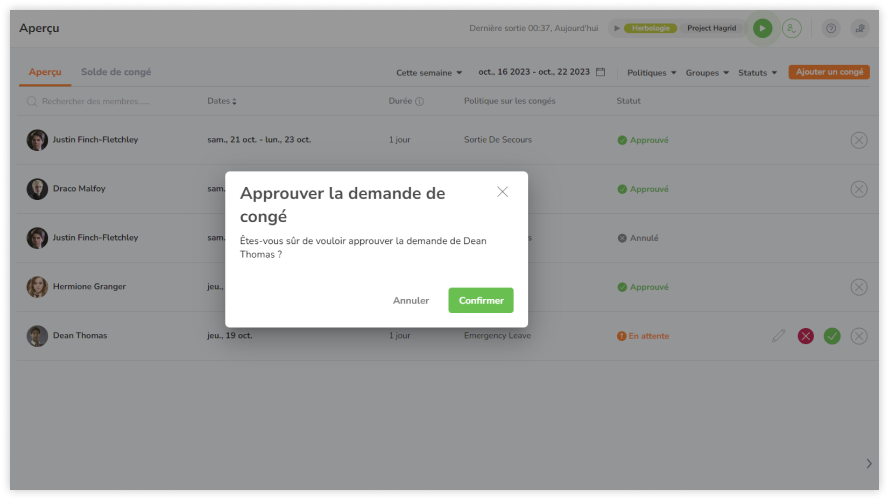 - Cliquez sur le bouton vert d’approbation pour le congé que vous souhaitez approuver.