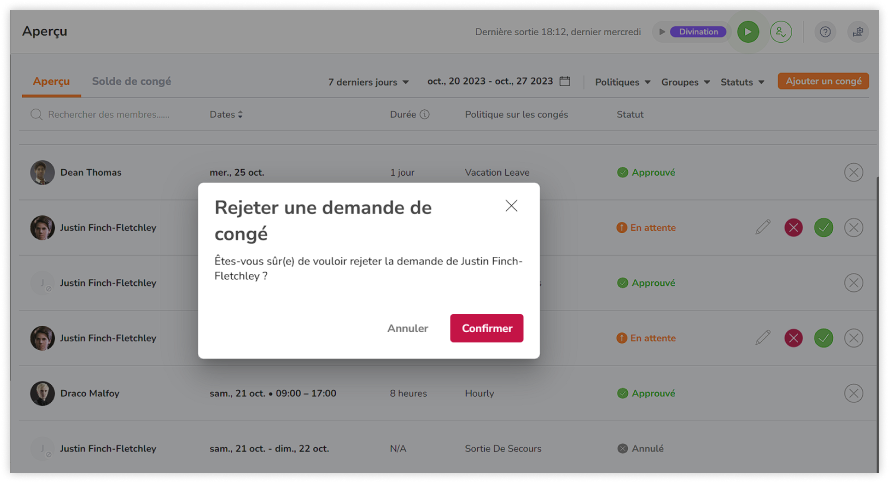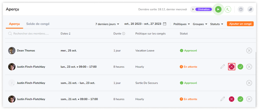 - Cliquez sur le bouton rouge de rejet de la demande de congé que vous souhaitez rejeter.