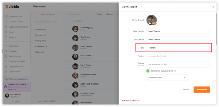 En tant que Propriétaire ou Administrateur, vous pourrez modifier le rôle d’un employé via sa page de profil.