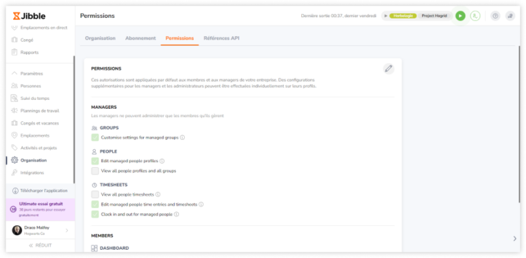 - Modification des paramètres de l’organisation – ajuster les paramètres de l’organisation tels que les paramètres de suivi du temps, les activités et les projets, les lieux, les paramètres de congés et les plannings de travail.
