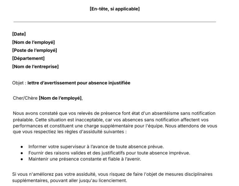 Lettre d’avertissement pour absence injustifiée