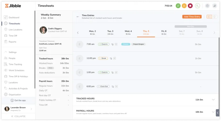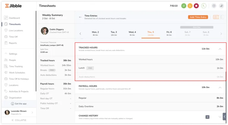 On the tracked hours tab of his detailed timesheets, Cedric has tracked a total of 11 hours on Monday. Tracked hours are all hours tracked in a day, including break hours. The breakdown of his tracked hours are as follows: