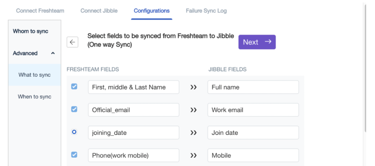 Choose which employee fields you want to sync from Freshteam to Jibble. Once you’ve selected the fields, click on Next.