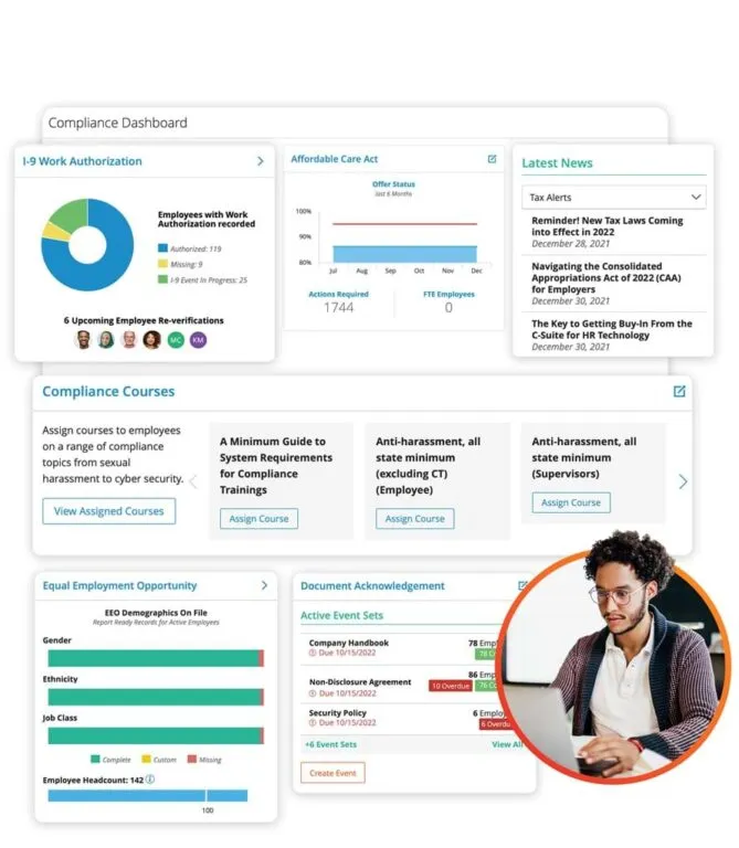 The dashboard keeps businesses updated with the latest tax and compliance law changes through a live news feed. It also offers interactive compliance training on crucial topics like sexual harassment and cyber security.