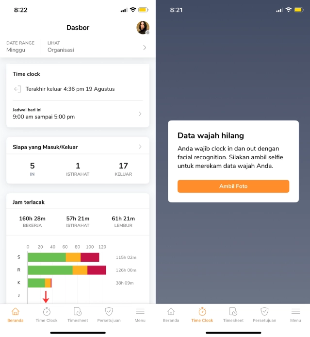Jika face recognition terus gagal dan Anda tidak bisa clock in, silakan perbarui atau ambil ulang data wajah.