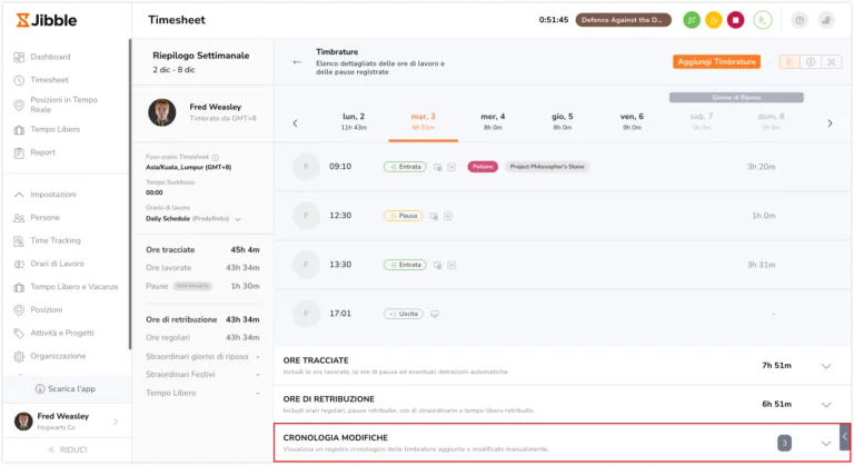 - Tutte le modifiche apportate alle timbrature o alle timbrature orarie, incluse le modifiche dell’ora, della durata, della posizione, dell’attività, del progetto e delle note