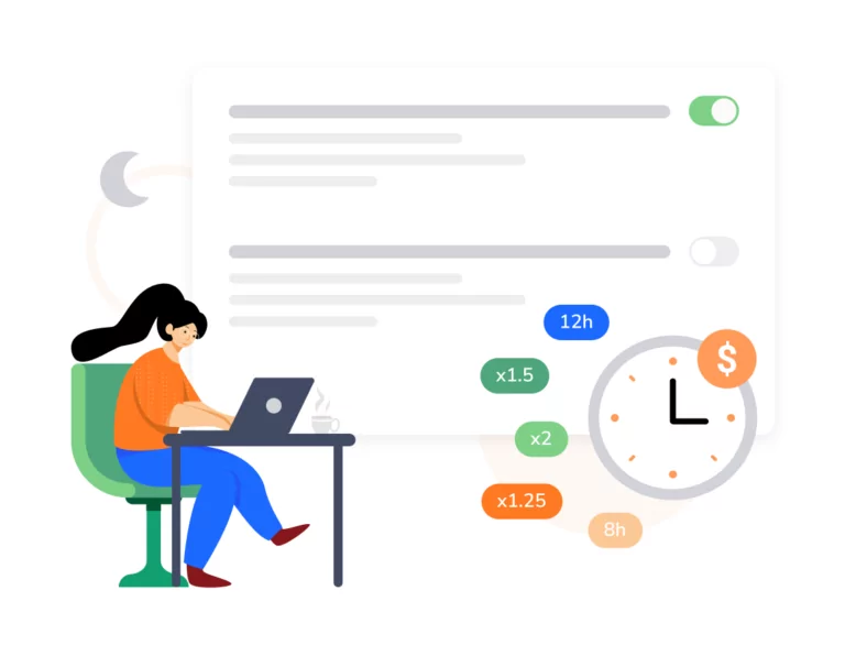 Pagamenti degli straordinari sempre precisi. Che si tratti di calcolare gli straordinari dopo un tempo minimo di lavoro stabilito, di avere pause retribuite o non retribuite, o di consentire del tempo prima dell’orario previsto, il rilevatore delle ore di retribuzione e il software di time tracking di Jibble, direttamente collegato ai timesheet, renderanno semplici le tue retribuzioni.