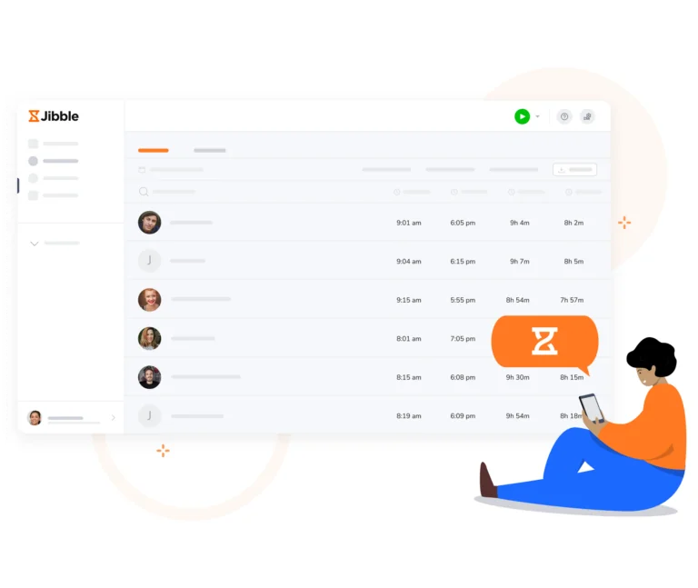 Utilizza Jibble in viaggio, su qualsiasi dispositivo, ovunque, tramite l’apprezzato registratore del tempo per iPhone o il registratore del tempo per Android, su tablet e cellulare, o su laptop e desktop tramite l’app web. Offri ai tuoi dipendenti la possibilità di registrare il tempo su un dispositivo adatto a loro e a te.