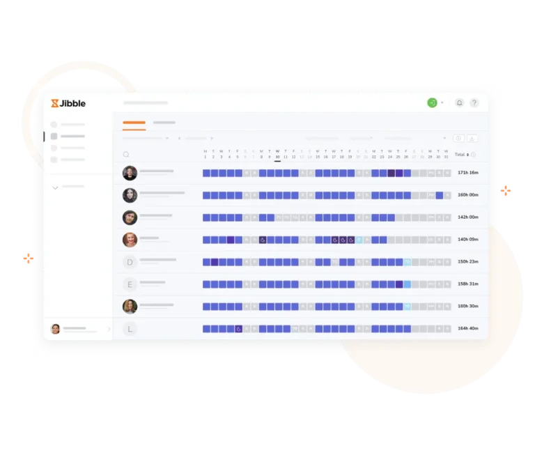 Jibbleは学生の出席をタイムシートに正確に記録し、学生が時間を費やした日々の活動の概要を提供します。タイムシートはJibbleのクラウド上に即座に更新され、出席記録が常に安全であることを保証します。