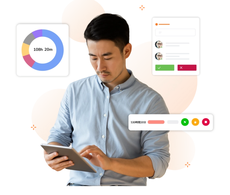 時間管理を改善するための第一歩は、時間がどこに使われているのかを把握することです。Jibbleを使えば、スピーディかつ手間なく時間を記録できます。ワンクリックで出勤打刻し、プロジェクト、顧客、または作業ごとに時間を確認できるため、時間の使い方が明確になります。