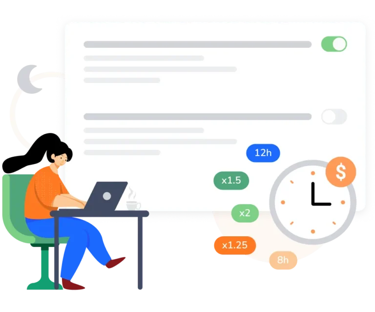 지블에서는 일일 초과 근무, 일일 이중 초과 근무, 휴식일 초과 근무, 주간 초과 근무, 공휴일 초과 근무 등 초과 근무가 시작되는 시기와 요율을 유연하게 설정할 수 있습니다.