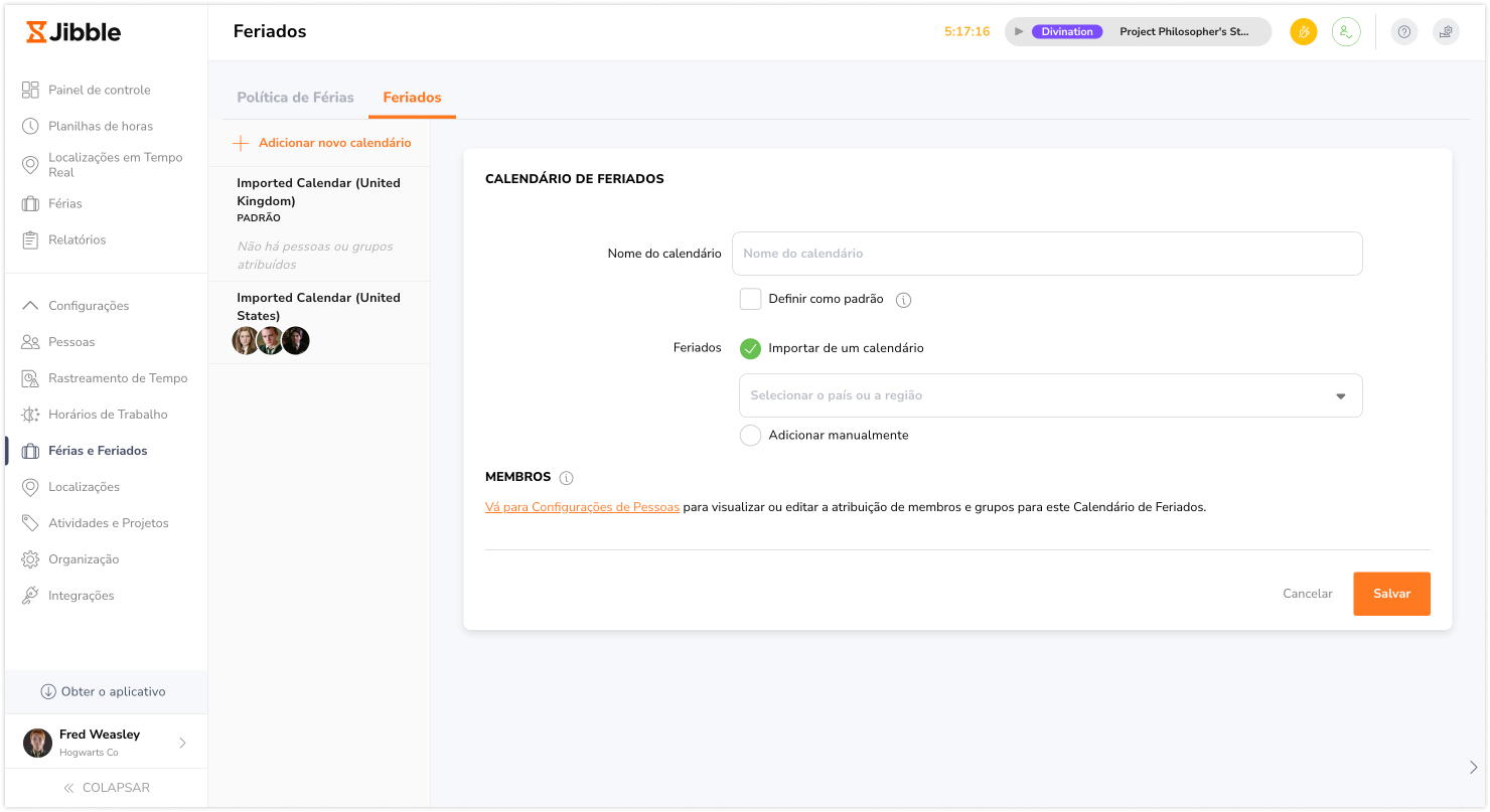 Os cálculos da folha de ponto para cada membro estarão alinhados com o calendário de feriados ao qual eles estão atribuídos.