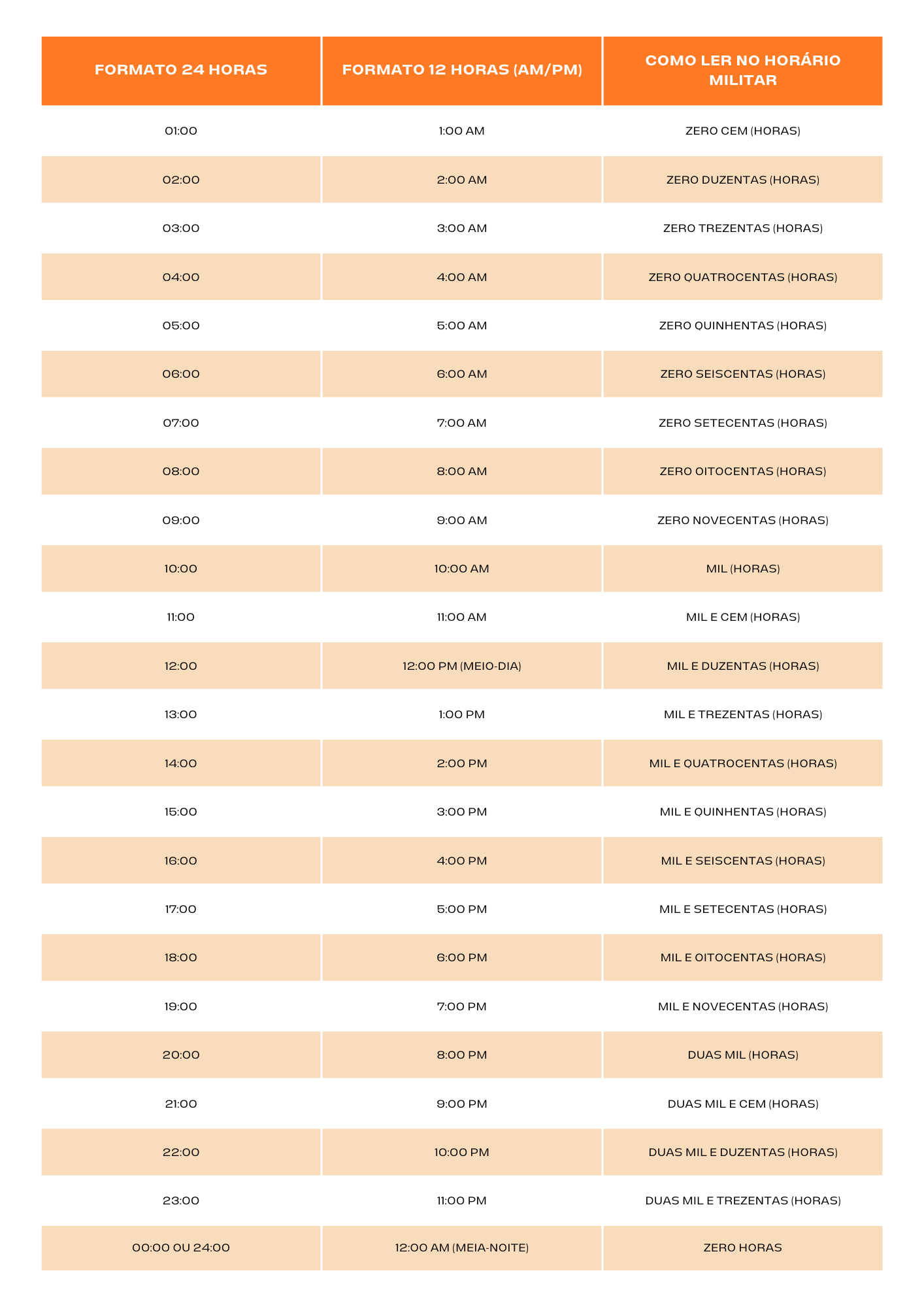 Curiosidade: Você sabia que mesmo que nos EUA seja usado o formato de 12 horas, eles também têm uma variação do formato de 24 horas? Por lá, é conhecido como “Horário Militar”.