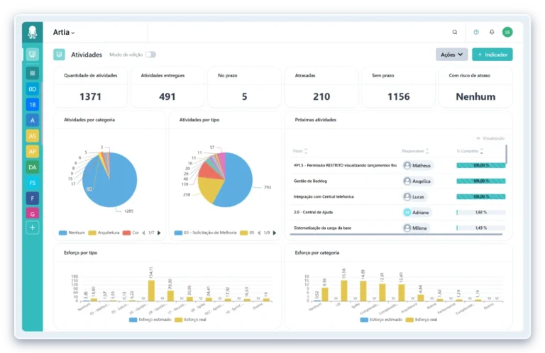 Outro grande diferencial está na flexibilidade e na integração: o Artia se adapta a diferentes tipos de projetos (ágeis, preditivas ou híbridas) e se conecta facilmente a outras ferramentas corporativas, centralizando informações e reduzindo ruídos na comunicação.