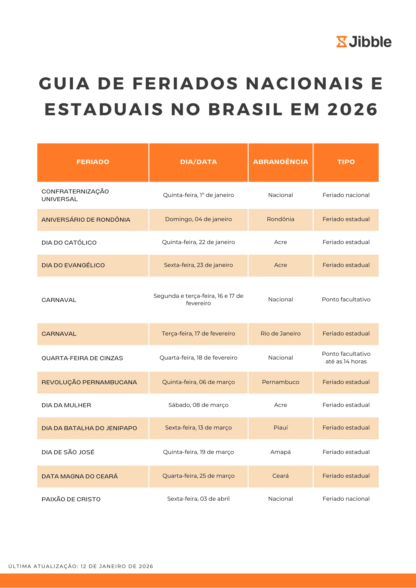 PDF de feriados no Brasil em 2026, nacionais e estaduais
