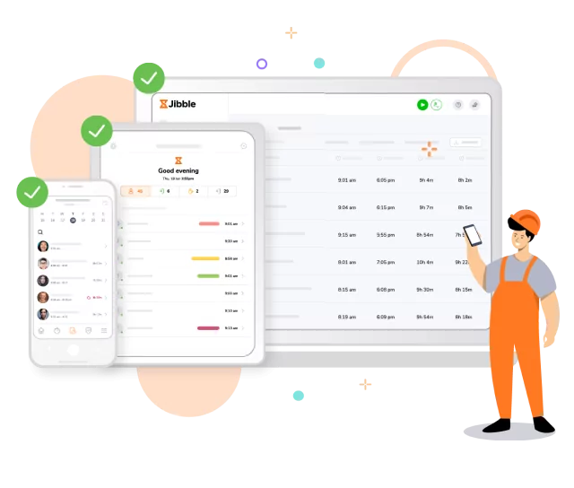 Abra o Jibble em seu dispositivo Android ou iPhone quando estiver em locais de construção. Ou vá ao app web do Jibble ou extensão para Google Chrome quando estiver de volta em seu notebook no escritório. Rastreamento perfeito de horas e presença a qualquer momento, em qualquer lugar.