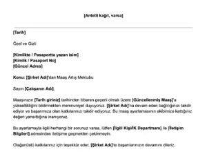 Bir çalışana maaş artışını resmi olarak bildirmek için kullanılan mektup şablonu.