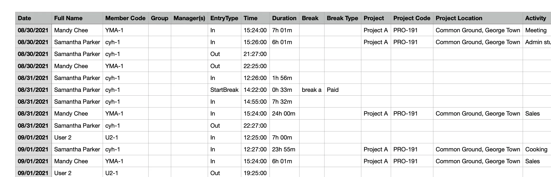 Bu ayrıntılı dosya; projeler, faaliyetler, notlar, giriş cihazları, giriş konumları ve daha fazlasına dair çeşitli veriler de dahil olmak üzere her çalışanın bireysel zaman girişleri hakkında bilgi sunar. Zaman girişleri listesinde nelerin yer aldığına dair kapsamlı bir açıklama için, dışa aktarılabilecek farklı rapor türleri hakkındaki makalemize göz atın.